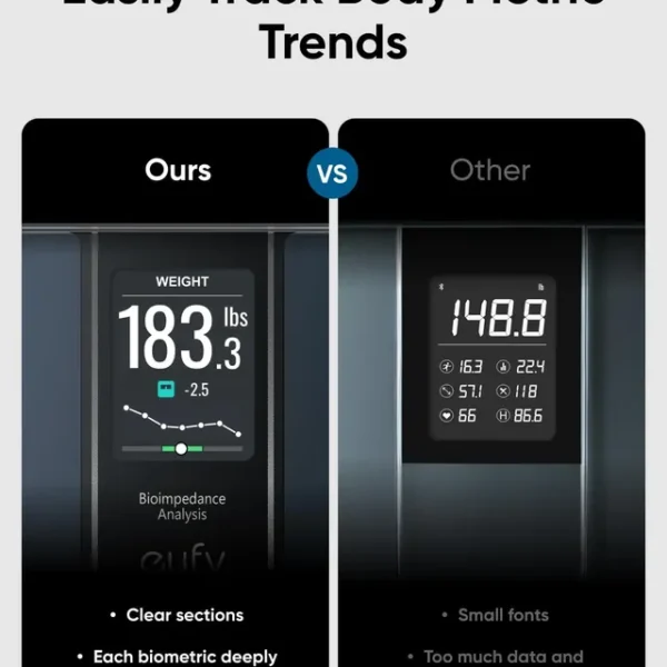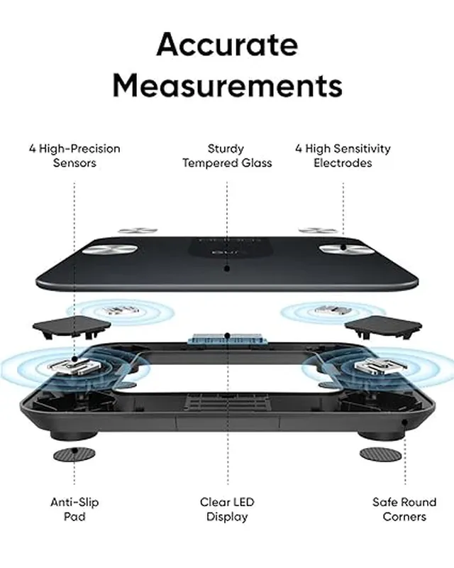 - Tracks 12+ body metrics: weight, body fat%, water %, muscle mass, bone mass, visceral fat, BMI, and more