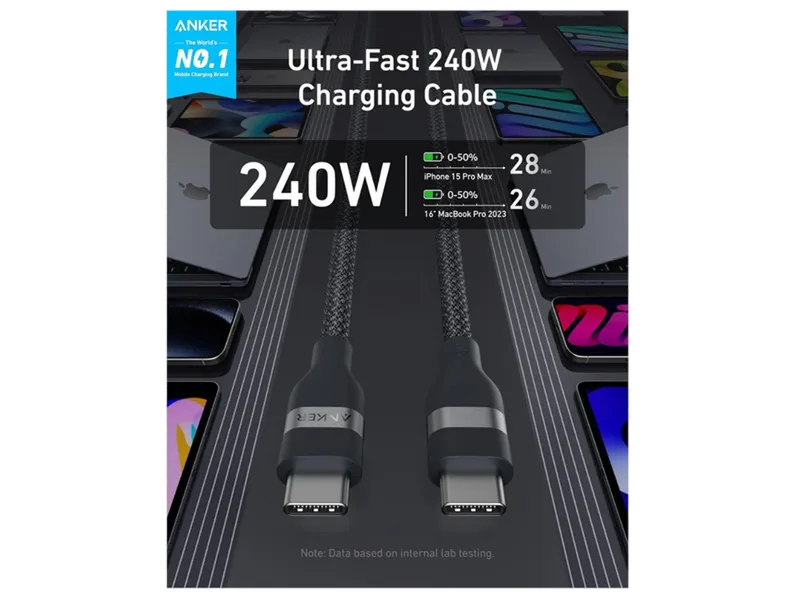 - 1.8m USB-C to USB-C braided cable with 240W fast charging