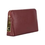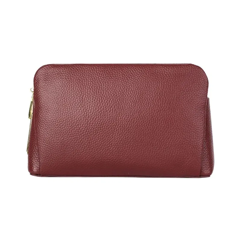 - Pebble-textured wine-red pouch with a clean, structured silhouette