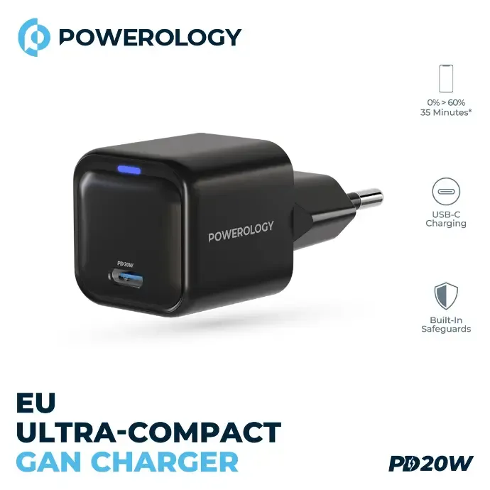 Presenting the Powerology Ultra-Compact 20W Gan PD Charger, a stylish black device designed specifically for EU outlets that combines speed and safety. Your gadgets will be charged quickly with its USB-C fast charging feature, going from 0% to 60% in just 35 minutes. With a 20W PD Type-C output, this charger guarantees excellent performance with its EU 2-pin layout. Furthermore, its integrated security features provide a secure and harmless charging experience every time.